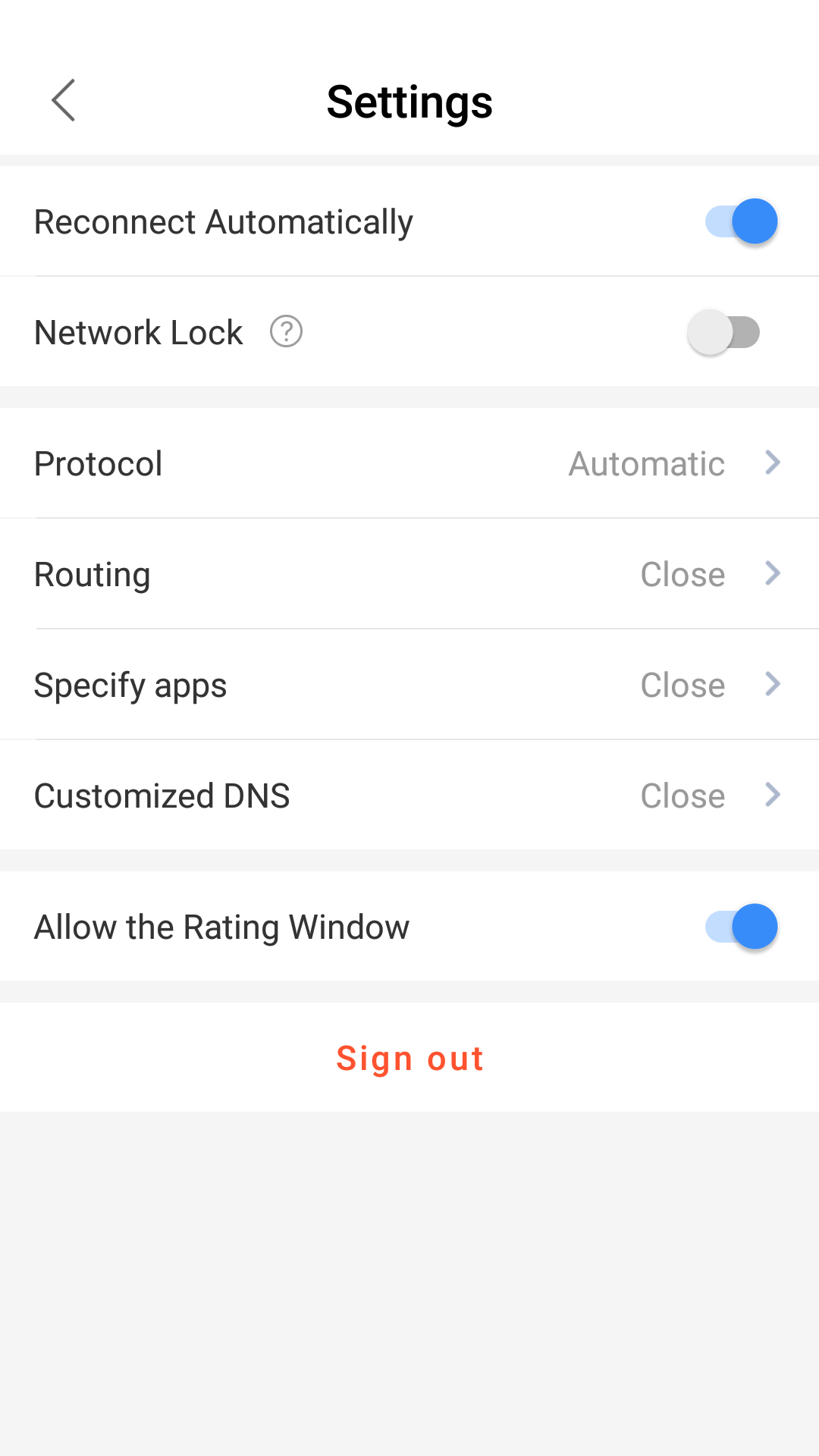 8. Settings include: Reconnect Automatically, Routing, Network Lock, Specify apps and other functions.