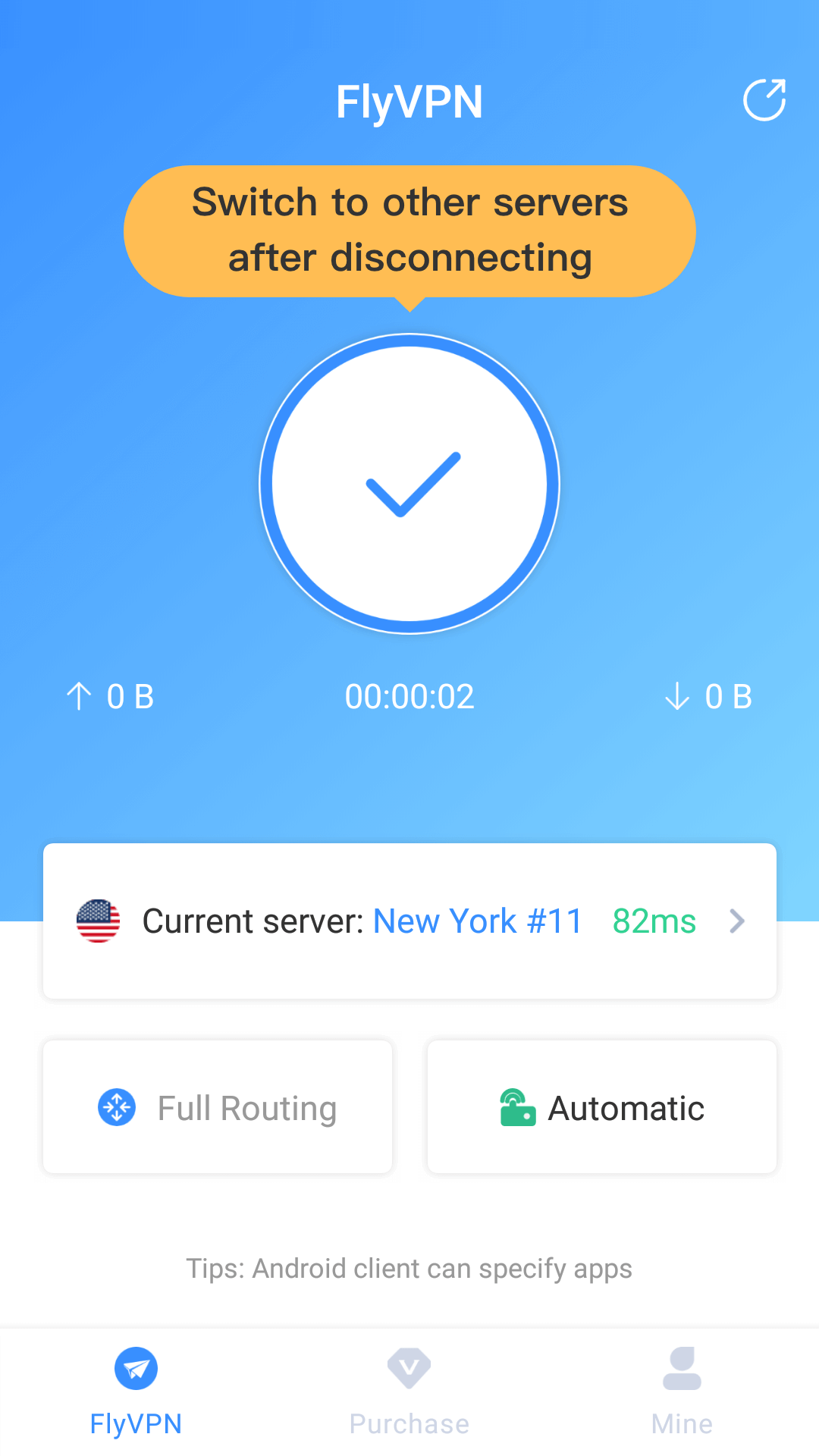 2. Click the Servers button on the homepage to enter the servers list, select a server, and click Connect. FlyVPN has the function of [Auto Match] which means that it will automatically select an appropriate server for you when clicking the country you need . If you need a specific server, please click the button on the right of the country to select the city you need.