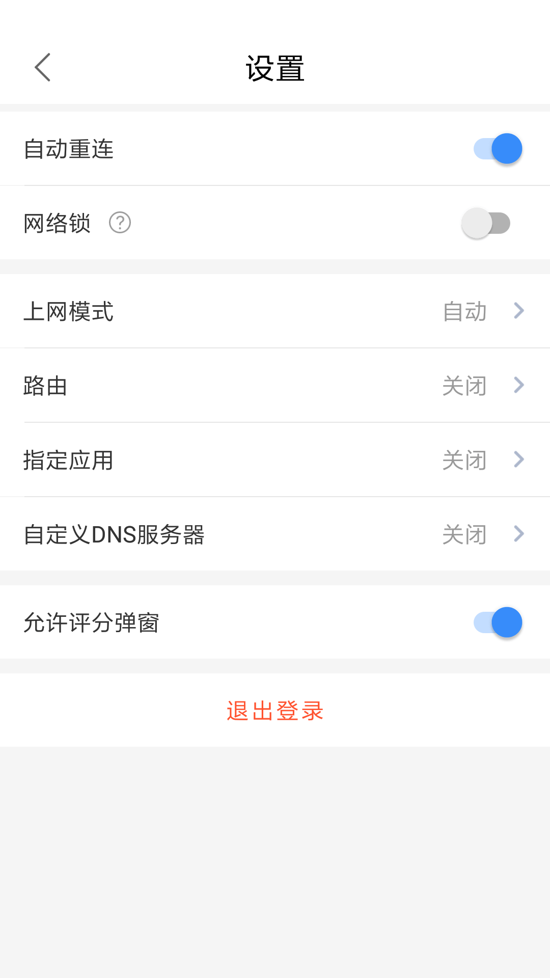 8. 账号设置中包括:自动重连、路由、网络锁、指定应用等功能。