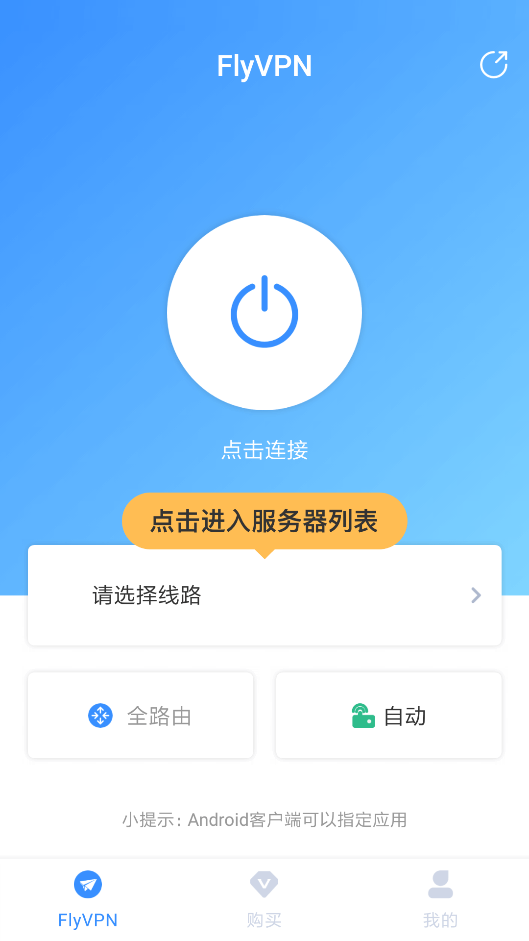 2. 首页点击服务器按钮,进入服务器列表。FlyVPN支持【自动匹配节点】功能,点击所需国家即可为您自动选择合适的服务器。如需具体线路,请点击国家右侧按钮根据城市进行线路选择。