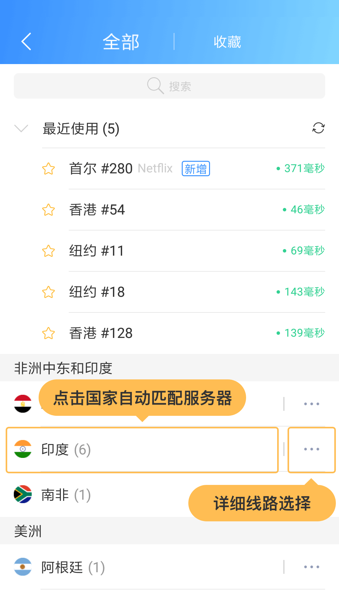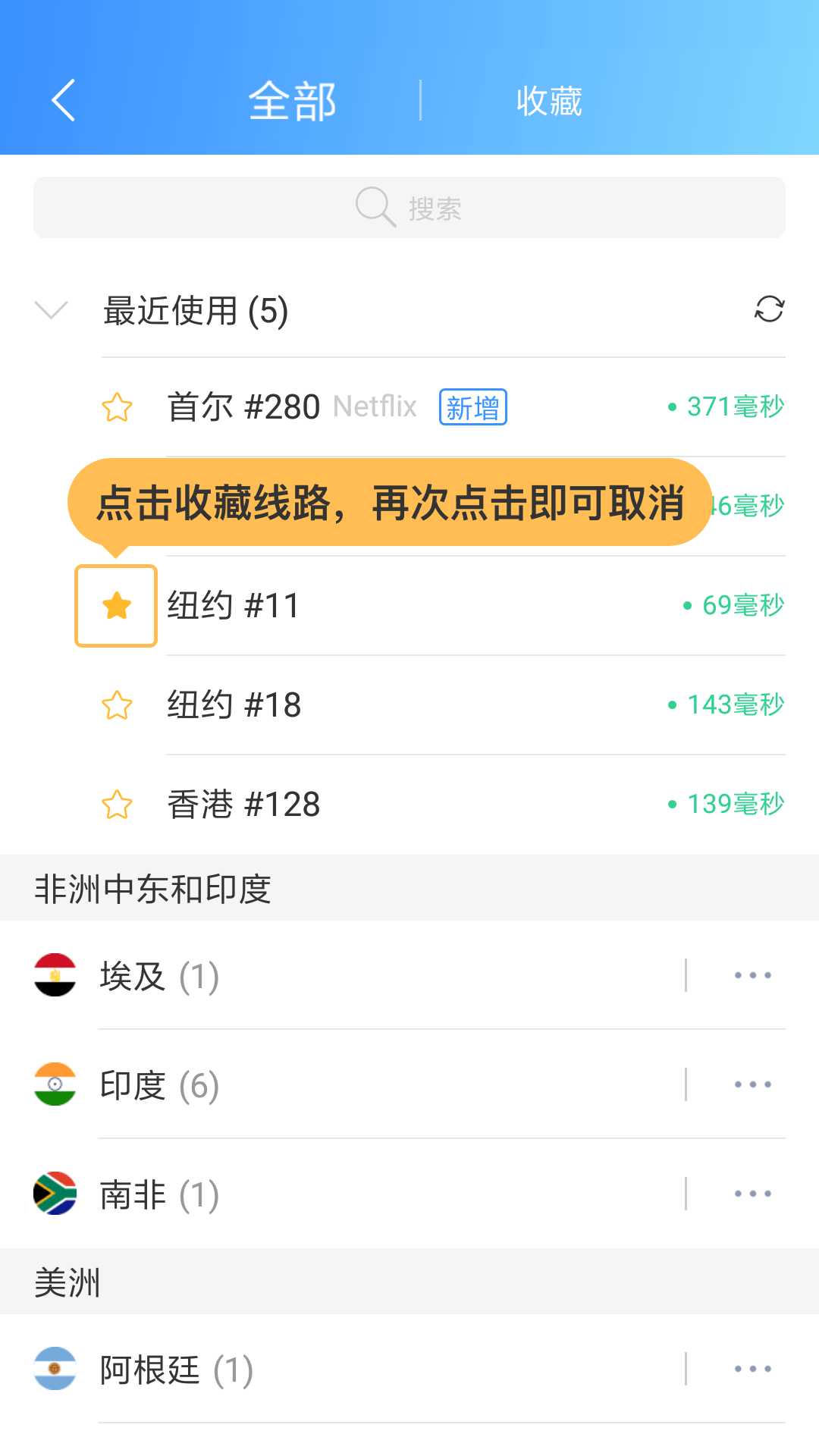 4. 服务器列表分为“全部”和“收藏”,点击服务器前端“星标”即可收藏线路,再次点击即可取消收藏,收藏的线路保存在收藏列中。