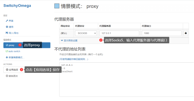 选择“proxy”→选择“Socks5”代理→输入主机、端口信息→点击 “应用选项”,完成设置