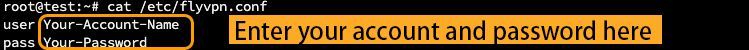 1. Create a configuration file named flyvpn.conf under the /etc directory, and fill in the FlyVPN account and password.