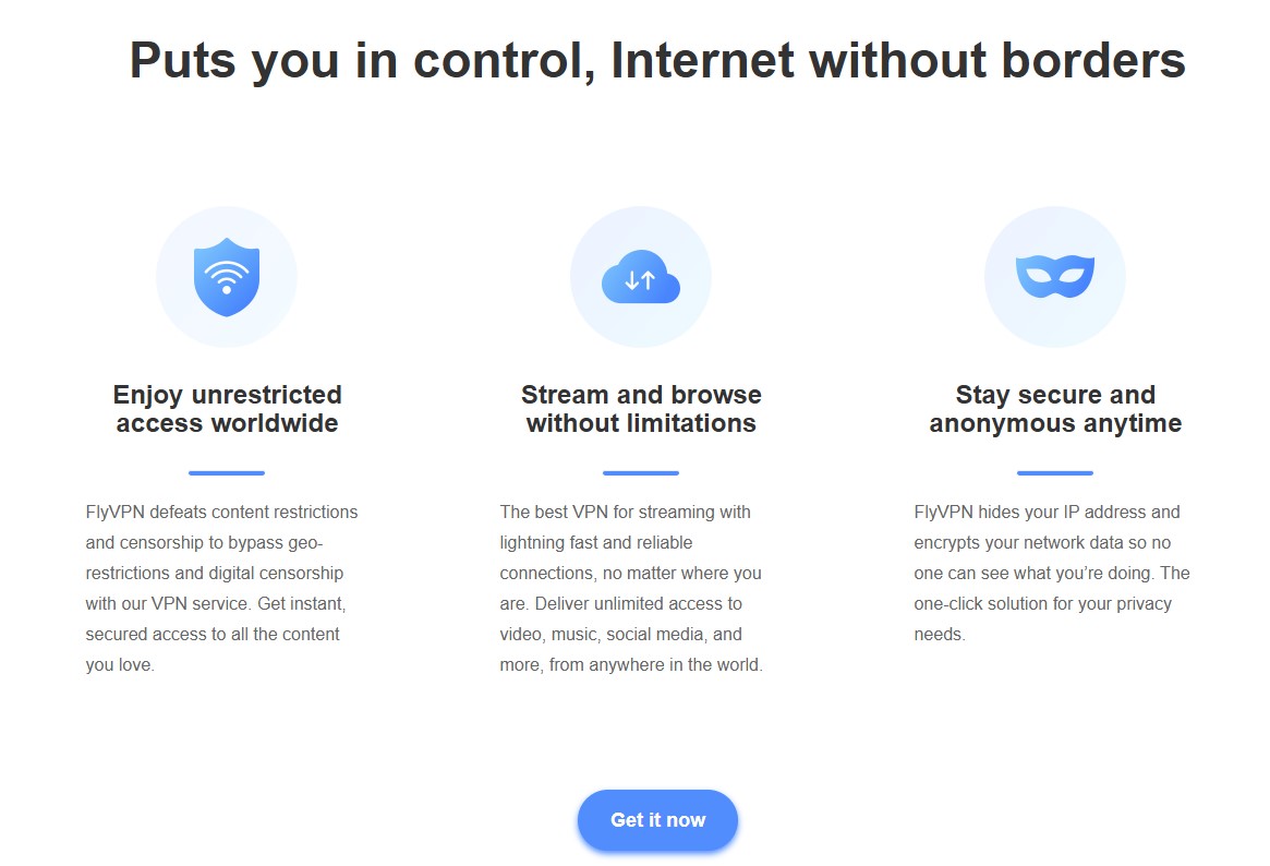 1. Enjoy the Internet with no restrictions. FlyVPN offers access to more than 40 of the most popular countries. No matter where you are, you can easily enjoy the Internet with no restrictions and anonymous access to the entire Internet.