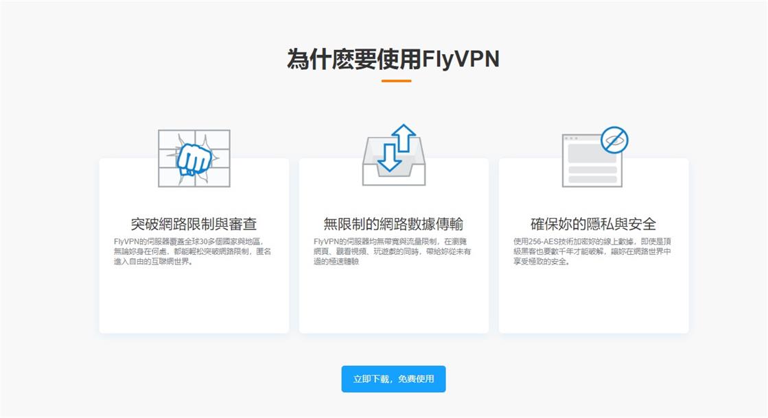 1. Fly能輕鬆突破網路限制與審查。FlyVPN的伺服器覆蓋全球30多個國家與地區,無論你身在何處,都能輕鬆突破網路限制,匿名進入自由的互聯網世界