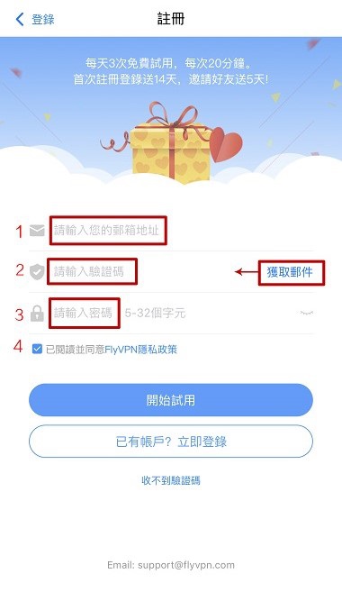 1.註冊登錄:在您的iPhone手機下載FlyVPN,根據要求創建或登錄FlyVPN賬戶。
