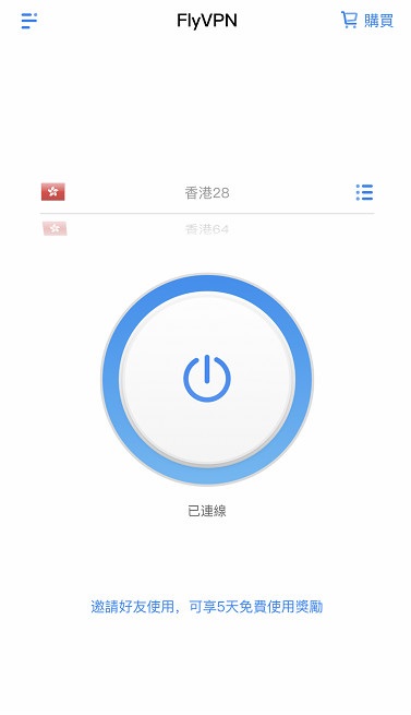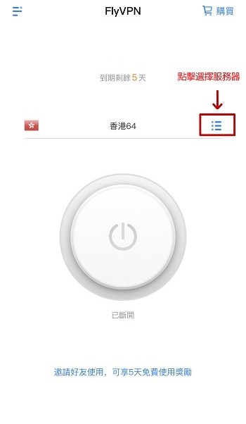 4.連接服務器:選擇服務器進行連接,請注意開關按鈕圖標變為藍色即為連接成功。再次點擊即可斷開連接。