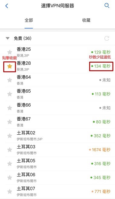 3.服務器說明:點擊收藏按鈕即可收藏線路,建議選擇延遲低的服務器使用。